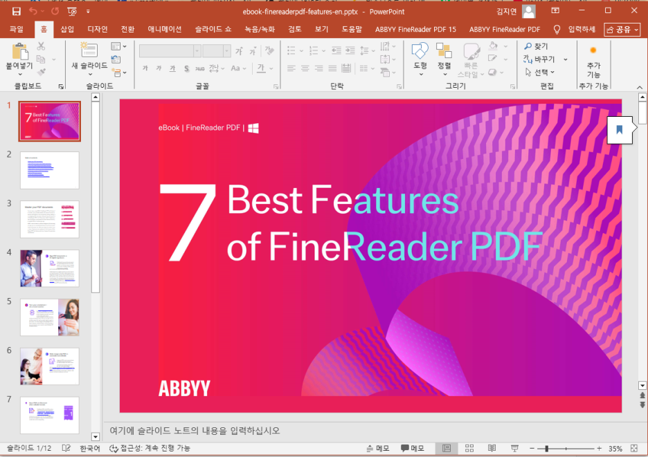 ABBYY FineReader는 PDF 레이아웃을 유지하면서 정확하게 PPT로 변환해주기 때문에, 발표 자료나 강의 자료를 바로 만들 수 있습니다.